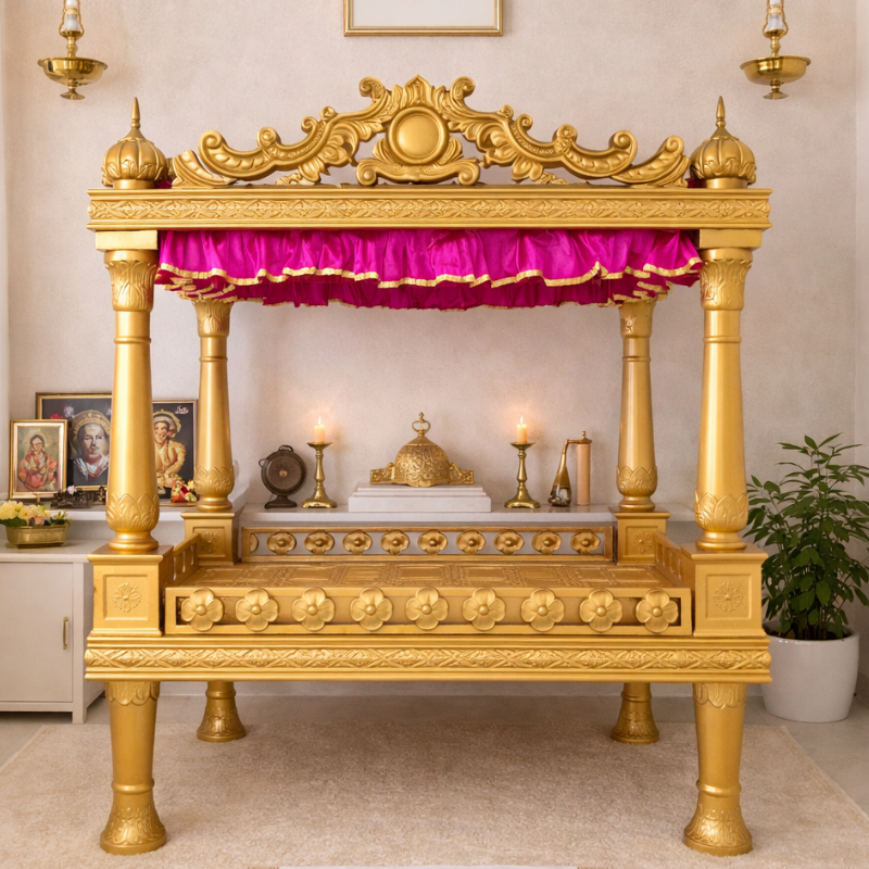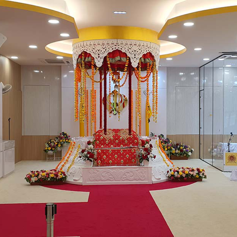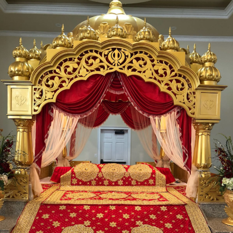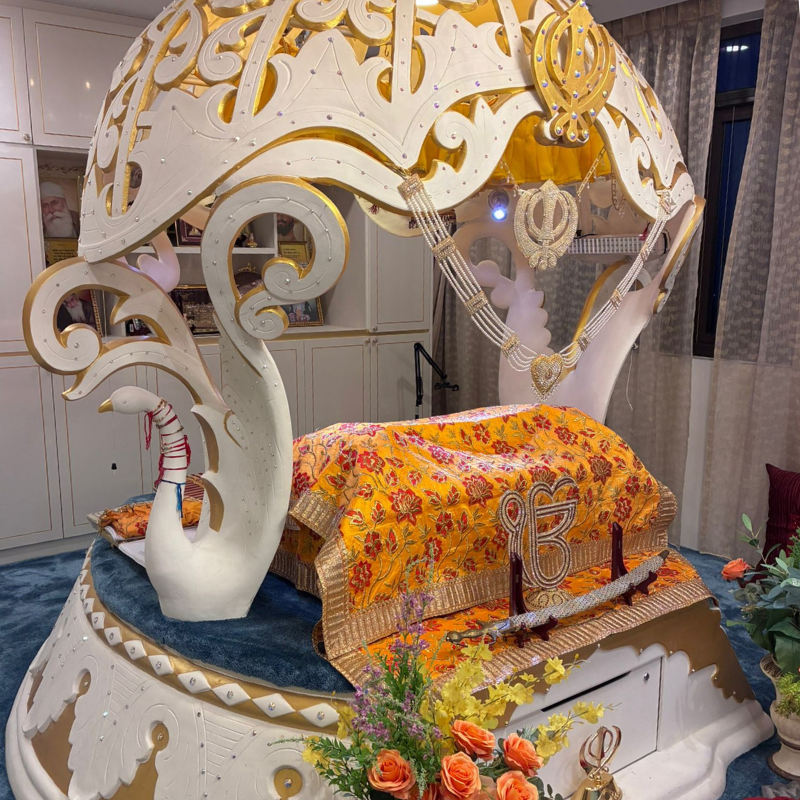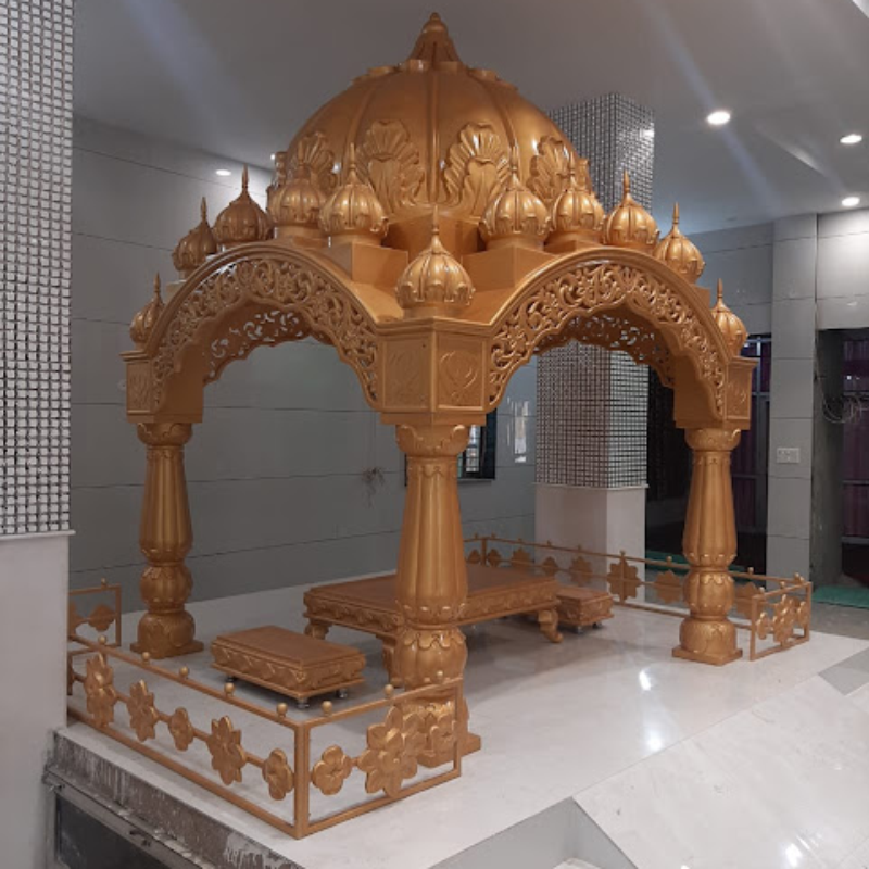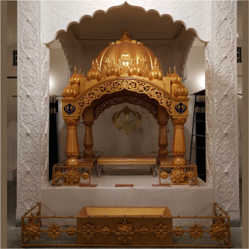Modern-design Fibreglass Palki Sahib by Asia Fibre Arts, featuring elegant side grill, Golak, and intricately carved pillars. Proudly displayed at Central Sikh Temple Gurudwara Singapore, crafted for durability and refined Gurudwara aesthetics.